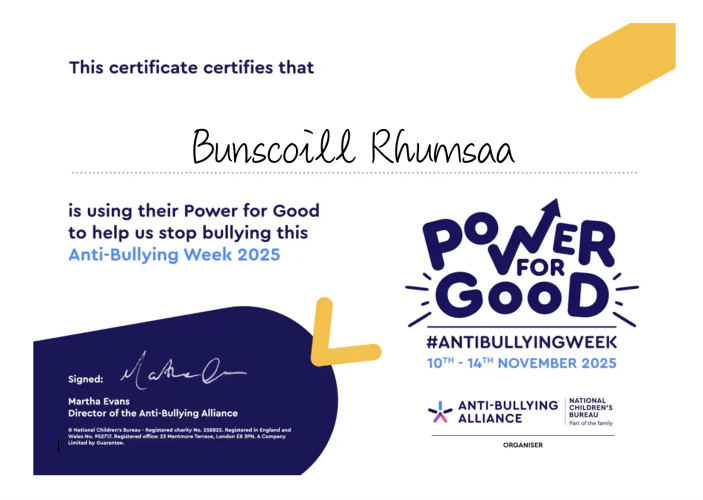 As long-term associate members of the Anti-Bullying Alliance, we're proud to be taking part in Anti-Bullying Week 2025 here at Bunscoill Rhumsaa! The week kicks off on Monday with Odd Socks Day – a fun and colourful way to celebrate what makes us all unique and to show that there's no place for bullying in our school. We’re excited to stand together, raise awareness, and keep kindness at the heart of everything we do. You can find out more about the campaign by visiting the Anti-Bullying Alliance website.