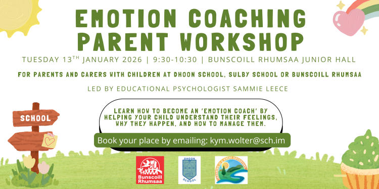 We are delighted to invite parents and carers to an Emotion Coaching Workshop on Tuesday 13th January 2026, in Bunscoill Rhumsaa's Junior Hall. Led by Educational Psychologist Sammie Leece, this practical session will help you learn how to become an “Emotion Coach” for your child: supporting them to understand their feelings, why they happen, and how to manage them effectively. Emotion coaching is a powerful approach that helps children build resilience, develop positive relationships, and manage big emotions in healthy ways.