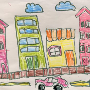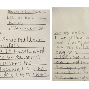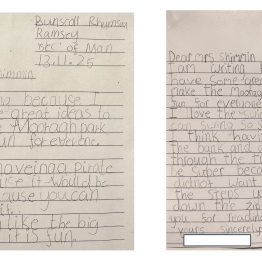 The project also included a real-world challenge: pupils wrote letters to Ramsey Town Commissioners with their ideas for improving Mooragh Park’s play area. Suggestions ranged from pirate ships and zip-lines to big tube slides – all designed to make the park more fun for everyone! Alongside their writing, the children created vibrant artwork inspired by the streets and buildings of Ramsey, capturing the character and colour of our town.